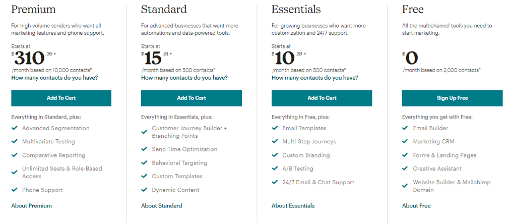 Du solltest auch wissen, dass es bei ActiveCampaign keinen kostenlosen Plan gibt, während du bei Mailchimp 10.000 E-Mails pro Monat kostenlos an 2000 Kontakte senden kannst.
