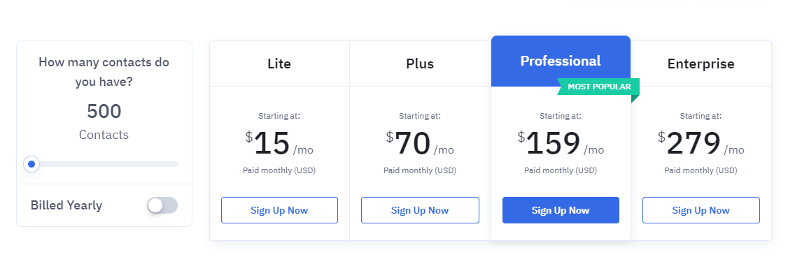 Viele Leute sagen, dass ActiveCampaign wegen seiner vielen Funktionen ein Vermögen kosten könnte, aber das stimmt nicht. Die Preise von ActiveCampaign sind im Vergleich zu MailChimp günstiger.