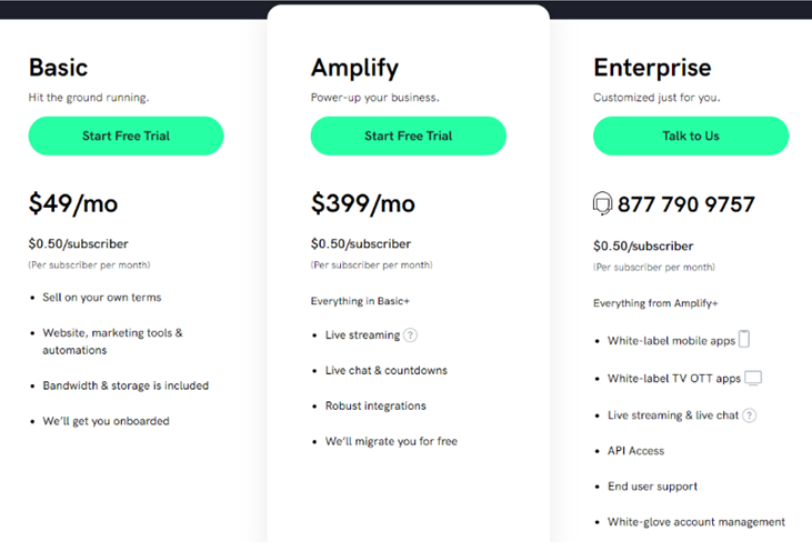 Alle diese Pläne beinhalten bereits Automatisierungs- und Marketing-Tools mit Speicherplatz und Bandbreite. API-Zugang, Endnutzer-Support, Fitness-Tracker mit der Apple Watch und White-Label-TV- und Mobile-Apps sind nur im Enterprise-Tarif enthalten.