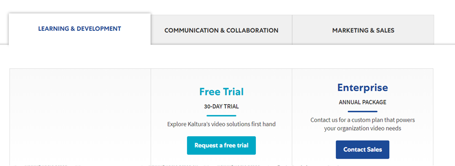 Die Preispakete von Kaltura richten sich nach Vertrieb und Marketing, Zusammenarbeit und Kommunikation sowie Entwicklung und Lernen.