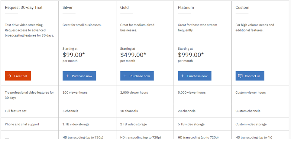 Das Vertriebsteam nennt dir auch Preise für individuelle Pläne. Die Pläne unterscheiden sich in WebRTC, Übertragungen, Stream-Planung und der durchschnittlichen Länge der Übertragung, Bandbreite, CDN-Bandbreite und Egress.