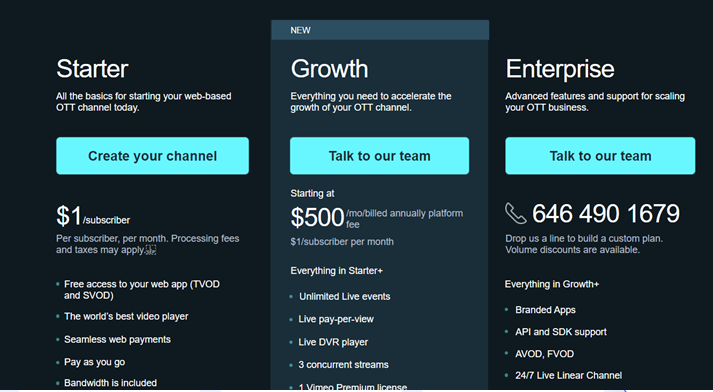 Vimeo OTT bietet drei Preisstufen an: Starter, Growth und Enterprise. Alle diese Tarife kannst du 30 Tage lang testen.