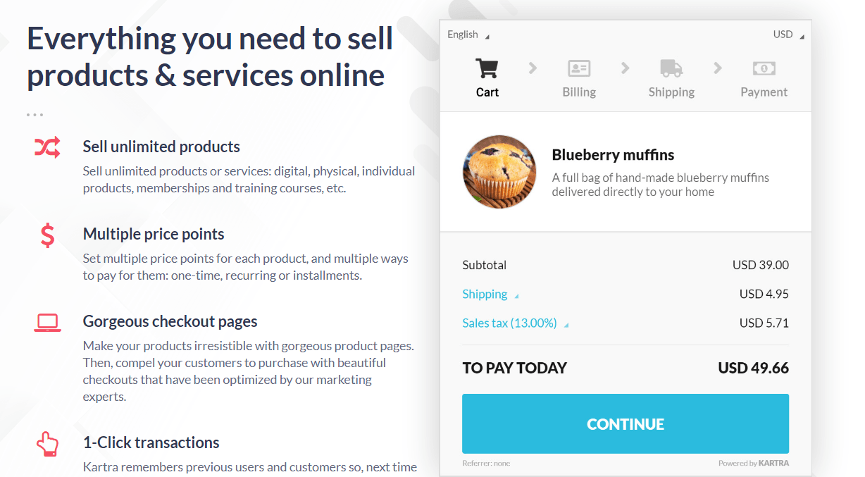 Die Preise von Kartra beginnen bei 99 $/Monat. Außerdem gibt es keine Transaktionsgebühren. In der Basisversion fehlen jedoch einige wichtige Funktionen der Plattform. Zum Beispiel ist die Möglichkeit, Produkte hinzuzufügen, im Basisplan begrenzt.
