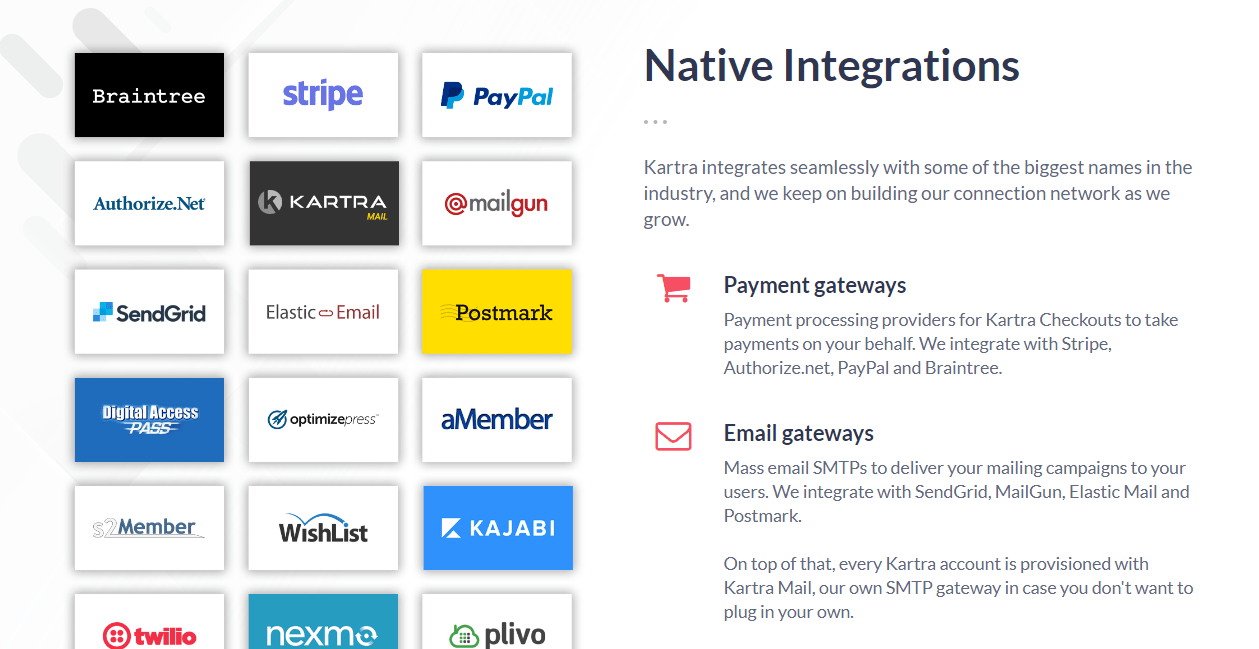 Zusätzlich zu der oben genannten Aussage ist Kartra in der Lage, sich in mehr als 20 verschiedene Produkte, Dienste, Tools und vieles mehr zu integrieren. Die Integrationen können in den folgenden Kategorien erleichtert werden: