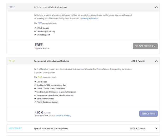 Um dich anzumelden, musst du die Anmeldeseite von ProtonMail in deinem Webbrowser öffnen. Wähle dann Anmeldung> Kostenlos> Wähle den kostenlosen Plan. Du kannst auch den Premium-Plan wählen, wenn du zusätzliche Funktionen wie Filter oder mehr Speicherplatz haben möchtest.