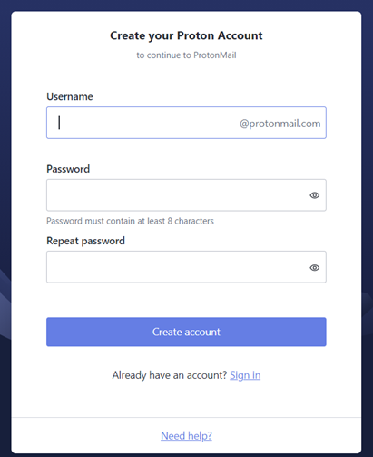 Gib im Bereich Domain und Benutzername unter dem Abschnitt zum Erstellen deines Kontos deinen Benutzernamen für die ProtonMail ein. Konto. Als Nächstes gibst du das Passwort ein und bestätigst dein Passwort. Das ist das Passwort, mit dem du dich bei deinem ProtonMail-Konto anmelden wirst.
